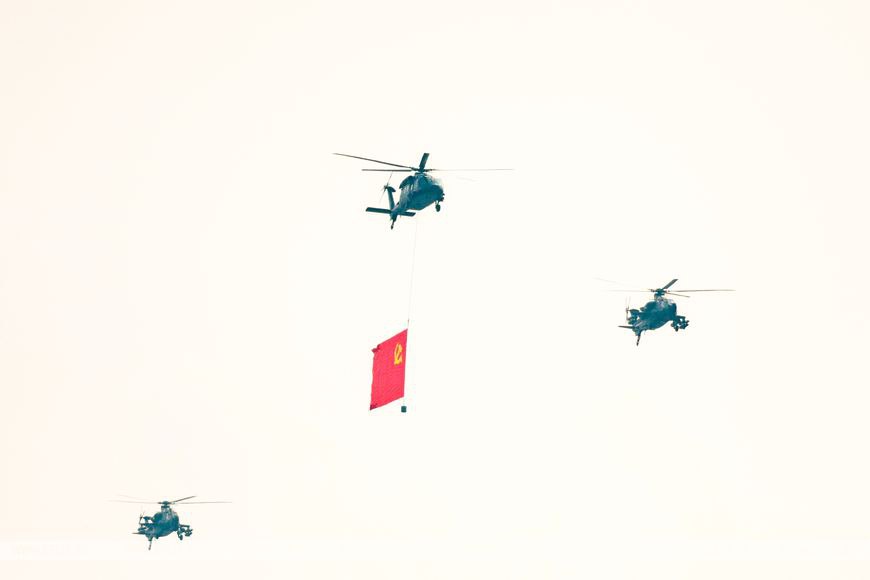 En el desfile se mostró la última tecnología aeronáutica china: portamisiles, helicópteros, cazas y aviones de transporte. Los abanderados aéreos llevaron sobre la capital la bandera nacional de China y la bandera del Ejército Popular de Liberación. Los helicópteros dibujaron en el cielo el número 80. Al final del desfile, se soltaron al aire 80 000 palomas como símbolo de la paz.-0-